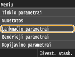 Jei nurodytą laikotarpį mygtukas nepaspaudžiamas, inicijuojama, kad vietoj esamo ekrano ir parametrų būtų rodomas numatytasis ekranas (automatinis atkūrimas). Nurodykite intervalą, po kurio atliekamas automatinis atkūrimas. Pasirinkite <0>, jei automatinio atkūrimo funkciją norite išjungti. Automatinis atkūrimas neatliekamas šiais atvejais: