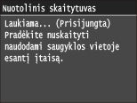 Jei per nurodytą laikotarpį, kol rodomas toliau pateiktas ekranas (aparatas nustatytas naudoti tinkle nuskaitant), neatliekamas nuskaitymas, automatiškai išjungiamas aparato tinklo ryšys. Nurodykite laikotarpį, po kurio išjungiamas aparato tinklo ryšys. Taip pat galite nustatyti, kad aparatas liktų prijungtas prie tinklo.