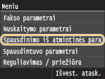 Visi atminties laikmenos spausdinimo parametrai išvardyti su trumpais aprašais. Numatytieji parametrai pažymėti durklu (