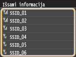 Galite ieškoti belaidžių maršrutizatorių (arba prieigos taškų), prie kurių galima prisijungti, ir pasirinkti vieną iš rodomų aparato ekrane. Kaip tinklo raktą įveskite WEP raktą arba PSK. Prieš pasirinkdami belaidį maršrutizatorių, patikrinkite ir užsirašykite reikalingą sąrankos informaciją, įskaitant SSID ir tinklo raktą (