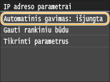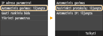 ![]() Jei rodoma <Įjungta>, bakstelėkite <Automatinis gavimas> ir nustatykite, kad <Pasirinkti protokolą> ir <Automatinis IP> būtų nustatyta kaip <Išjungta>.
