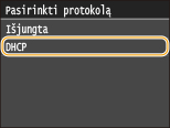 Bakstelėkite <Išjungta>. Jei pasirenkate <DHCP>, kai šios paslaugos nėra, aparatas gaiš laiką ir veltui naudos ryšio išteklius tinkle ieškodamas šios paslaugos.