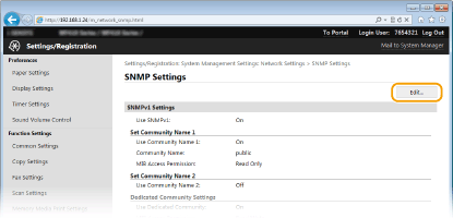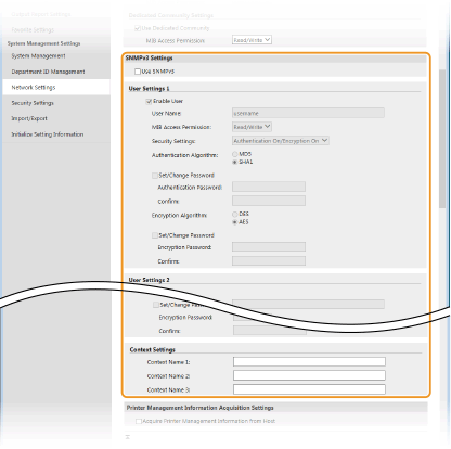 Paprastas tinklo valdymo protokolas (SNMP) – tai protokolas, skirtas tinklo ryšio įrenginiams stebėti ir valdyti naudojant valdymo informacijos bazę (MIB). Aparatas palaiko SNMPv1 ir didesnės saugos SNMPv3. Aparato būseną galite patikrinti kompiuteriu, kai spausdinate dokumentus ar naudojate priemonę „Remote UI“ (Nuotolinio vartotojo sąsaja). Galite įjungti SNMPv1 arba SNMPv3, arba abu vienu metu. Nurodykite kiekvienos versijos parametrus, kad atitiktų jūsų tinklo aplinką ir naudojimo paskirtį.