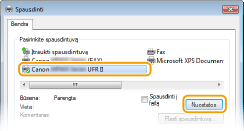 Nustatydami <Spausdinant suteikti pirmumą tvarkyklės parametrams> ties <Įjungta> galite spausdinti iš spausdintuvo tvarkyklės nurodyto popieriaus šaltinio, nepriklausomai nuo aparato popieriaus parametrų. Spausdinant suteikti pirmumą tvarkyklės parametrams