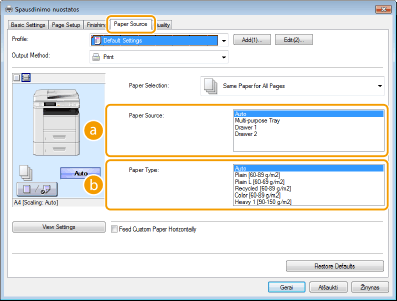 Popieriaus šaltinis automatiškai parenkamas pagal nurodytą popieriaus dydį ir tipą bei aparate nustatytus parametrus.