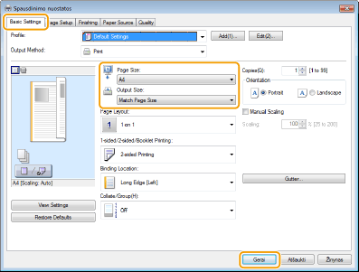 Pasirinkite popieriaus formatą [Output Size] (Išvesties dydis)
