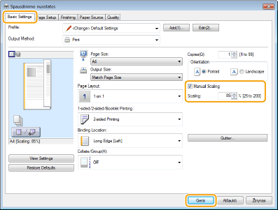 Įveskite spausdinimo mastelį [Scaling] (Mastelio keitimas)