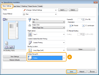Jei pasirinksite [Off] (Išjungta), ar spaudiniai bus rūšiuojami, priklausys nuo programoje atlikto nustatymo.