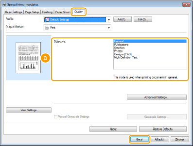 Pasirinkite parinktį, kuri atitinka dokumento tipą ar spausdinimo paskirtį. Pavyzdžiui, pasirinkite [General] (Bendrasis), jei norite naudoti įprastai, arba pasirinkite [Photos] (Nuotraukos), jei nuotraukų vaizdus norite spausdinti taikydami optimalią spausdinimo kokybę.