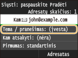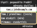 Kai nurodote kelis adresatus, antras ir paskesni adresatai turi būti įregistruoti adresų knygelėje arba LDAP serveryje. Cc ir Bcc laukeliams galite nurodyti tik adresatus, įregistruotus adresų knygelėje. Norėdami naudoti adresų knygelė arba LDAP serverį, turite iš anksto atlikti reikiamą registracijos procedūrą.