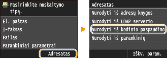 Norėdami kaip adresatus įregistruoti bendrai naudojamus aplankus arba FTP serverius, turite atlikti registracijos procedūrą iš kompiuterio.