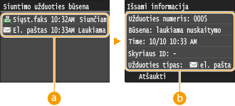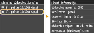 ![]() <Siuntimo užduoties žurnalas>Rodomas išsiųstų dokumentų sąrašas. Sėkmingai išsiuntus dokumentą, rodoma <Gerai>, o jei dokumento nepavyko išspausdinti, nes jis buvo atšauktas arba įvyko klaida, rodoma <Klaida>.