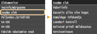 , kuvatakse kuva, mille kaudu saate vaadata prinditavate, saadetavate või vastu võetavate dokumentide olekut ja ka seadme olekut (nt tooneritaset jne) või võrguseadete teavet (nt seadme IP-aadressi).