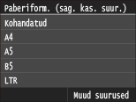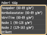 Kui paberi asetamisel seda kuva ei kuvataKui asetate multifunktsionaalsesse sahtlisse alati sama paberi, siis saate paberi määramise toimingud vahele jätta, salvestades paberiformaadi ja -tüübi vaikeseadetena. Kui on salvestatud vaikeseaded, siis ei kuvata ülaltoodud kuva. Kuva kuvamiseks valige <Määrake paberi laadimisel> (Multifunktsionaalse sahtli jaoks paberi vaikeseadete salvestamine).