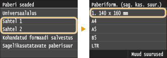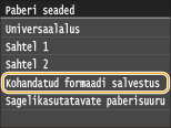 Paberisahtlitesse sisestatud paberi formaadi määramiseks kuvatakse ekraanil salvestatud paberiformaadid. Paberisahtlis oleva paberi formaadi ja tüübi määramine