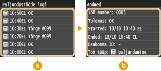 ![]() <Paljundustööde logi>Kuvatakse paljundatud dokumentide loend. <OK> kuvatakse siis, kui dokument paljundati edukalt, ning <Tõrge> kuvatakse siis, kui dokumendi paljundamine ebaõnnestus või tühistati mõni tõrke tõttu.
