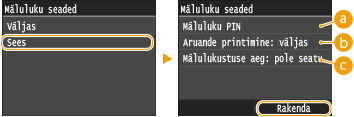 Vastuvõetud dokumentide talletamiseks mälus määrake seade <Mäluluku seaded> väärtuseks <Sees>. Samuti võite määrata valikulisi seadeid (nt turbeseade, mis nõuab funktsiooni vabastamiseks parooli, ja ajaseade, mis määrab päeval ajavahemiku, millal vastuvõetud dokumendid talletatakse mällu).