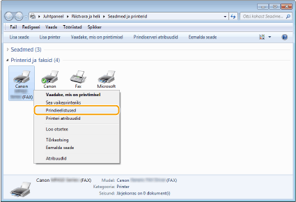 Paremklõpsake selle seadme faksidraiveri ikoonil ja klõpsake nuppu [Prindieelistused].