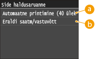 Valige <Sees>, kui soovite aruande printida automaatselt iga 40 edastuse järel, või <Väljas>, kui te ei soovi aruannet automaatselt printida.