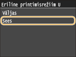 Kui määrate antud seadeks <Sees>, siis võib printimise kvaliteet langeda sõltuvalt paberi tüübist ja töötingimustest (täpsemalt, millal te trükite õhukesele paberile või kasutate masinat kõrge niiskusega keskkonnas)