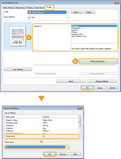 Valige [Toner Save] menüüst [Advanced Settings] kuval