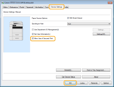 Klõpsake vahekaardil [Device Settings] (Seadme sätted) ja veenduge, et valitud on [Allow Use of Secured Print] (Luba kaitstud printimise kasutamine) kast.