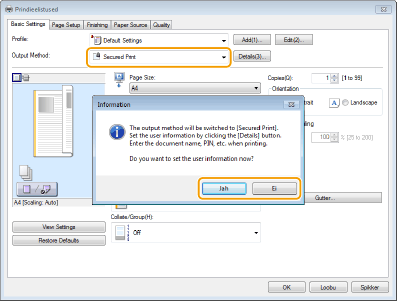 Valige [Secured Print] (Kaitstud printimine) valikus [Output Method] (Väljastusmeetod).