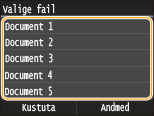 Kui mälus hoitakse vähemalt kahe kasutaja kaitstud dokumente, kuvatakse enne kuva <Valige fail> kuvamist kuva <Valige kasutaja>. Valige oma kasutajanimi.