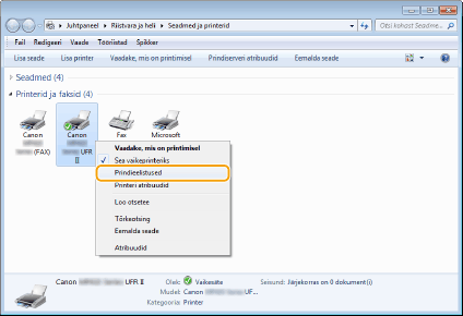 Paremklõpsake selle seadme printeri draiveri ikooni ja klõpsake nuppu [Prindieelistused].