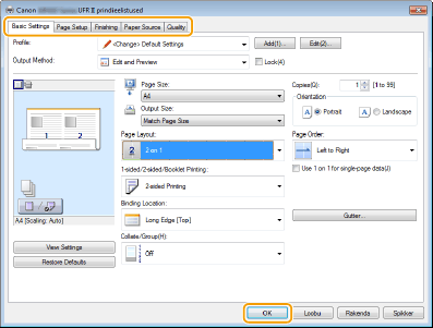 Vajutage [Basic Settings] (Põhisätted), [Page Setup] (Lehekülje häälestus), [Finishing] (Viimistlus), [Paper Source] (Paberiallikas), või [Quality] (Kvaliteet) vaheaknad, et vastavalt vajadusele määrata printimissätteid igal kuval.