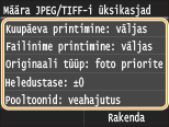 / , et reguleerida heledust, ja puudutage klahvi <Rakenda>.<Heledustase> ei ole saadaval TIFF failide printimiseks mis ei oma JPEG-tihendust.