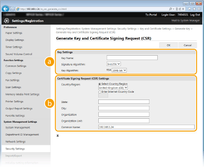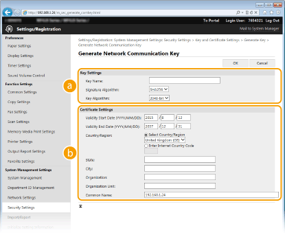 Võtmepaari saab luua seadmes kui seda on TLS (Transport Layer Security) krüptitud suhtluseks vaja. TLS'i saate kasutada, kui üritate seadmele ligi pääseda Remote UI (Kaugkasutajaliides) abil. Seadmele saab luua kuni viis (sealhulgas eelpaigaldatud) võtmepaari. Isemääratud sertifikaate kasutatakse „võrguühenduses” loodud võtmepaaridega. „Võtme ja sertifikaadi allkirjataotluse (CSR)” abil saab taotleda seadmega loodud võtmepaari jaoks sertimiskeskuse (CA) väljastatud digitaalsertifikaati.