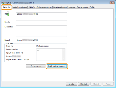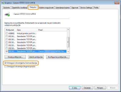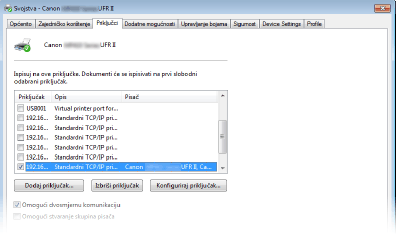 Ako koristite mrežnu vezu i promijenili ste IP adresu uređajaAko je [Opis] odabranog priključka [Canon MFNP priključak], a uređaj i računalo su na istoj podmreži, veza će se održavati. Nije potrebno dodavati novi priključak. Ako je [Standardni TCP/IP priključak], potrebno je dodati novi priklljučak. Konfiguriranje priključaka pisača