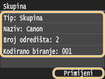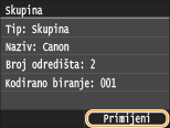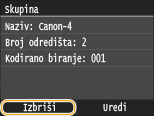 Više se odredišta može kombinirati u grupe. U grupi možete registrirati do 299 odredišta (za adrese e-pošte do 100 odredišta). Nakon registriranja grupe možete uređivati ili brisati odredišta.