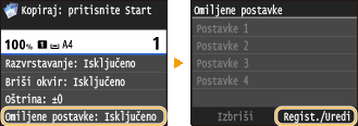 Možete registrirati do četiri često korištene kombinacije postavki kopiranja. Jednostavnim odabirom registrirane kombinacije postavki kada vam zatreba uklonit ćete potrebu za konfiguriranjem istih postavki pri svakom kopiranju: ako, primjerice, često kopirate dokumente u 5 primjeraka, postavite <Briši okvir> na <Uključeno>, i povećajte oštrinu kopiranja. Također možete prikazati postavke kao gumbe prečaca na zaslonu Početni zaslon.