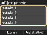 Ako želite izbrisati registriranu postavku, dodirnite <Kopiraj>  <Omiljene postavke>  <Izbriši>  Odaberite postavke  <Da>  <Da>.