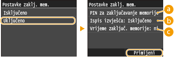 Da biste primljene dokumente spremili u memoriju, <Postavke zaključavanja memorije> postavite na <Uključeno>. Možete definirati i dodatne postavke, npr. sigurnosnu postavku koja zahtijeva unos lozinke za otključavanje značajke i vremensku postavku koja definira razdoblje tijekom dana kada se primljeni dokumenti pohranjuju u memoriju.