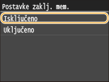 Da biste ispisali primljene dokumente iz memorije, <Postavke zaključavanja memorije> postavite na <Isključeno>. Ispisuju se svi dokumenti u memoriji.