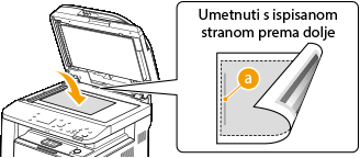 Postavite ispisani list za namještanje na kopirno staklo tako da njegova strana za ispis bude okrenuta prema dolje.