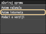 Kada je riječ o upravljačkom programu, odaberite njegov način nadogradnje ovisno o stanju postavljenog uređaja. Postoje dva načina nadogradnje: pristupite najnovijoj inačici upravljačkog programa za uređaj koja je dostupna na internetu i obavite njezinu nadogradnju ako inačica trenutačno instalirana na uređaju nije najnovija ili pristupite najnovijoj inačici upravljačkog programa na internetu putem računala i obavite njezinu nadogradnju putem računala ako inačica trenutačno instalirana na uređaju nije najnovija. Kada povezivanje na internet nije moguće putem bežičnog LAN-a, povežite se putem žičanog LAN-a ili USB-a i obavite nadogradnju putem računala.