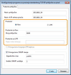 Pod [Protocol Type] (Vrsta protokola), odaberite [RAW] ili [LPR], i promijenite [Port Number] (Broj priključka).