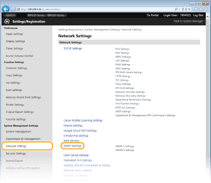 Jednostavan mrežni protokol za upravljanje (Simple Network Management Protocol, SNMP) protokol je za nadzor komunikacijskih uređaja na mreži i upravljanje njima pomoću baze podataka za upravljanje (Management Information Base, MIB). Uređaj podržava SNMPv1 i SNMPv3 s poboljšanim sigurnosnim značajkama. Možete s računala provjeriti stanje uređaja prilikom ispisa dokumenata ili korištenja sučelja Remote UI (Korisničko sučelje za daljinski pristup). Možete omogućiti SNMPv1 ili SNMPv3 ili oba istovremeno. Definirajte postavke za svaku od verzija u skladu s mrežnim okruženjem i svrhom korištenja.
