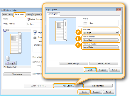 Odaberite položaj za ispis podataka, korisničko ime i broj stranica