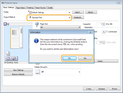 Odaberite [Secured Print] (Zaštićeni ispis) u [Output Method] (Metoda izlaza).