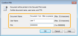 Unesite [Document Name] (Nazivi dokumenata), [User Name] (Korisničko ime), i [PIN] i kliknite [OK] (U redu).