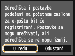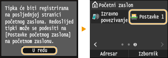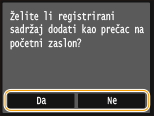 Ako odaberete <Da>, pojavit će se poruka. Provjerite poruku, a zatim dodirnite <U redu>. Registrirana kombinacija postavki dodaje se zaslonu Početni zaslon kao gumb prečaca.