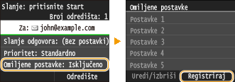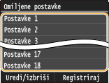 Za uređivanje i brisanje registriranih postavki, idite na <Skeniraj>  <E-pošta>/<I-Faks>/<Datoteka>  <Omiljene postavke>  <Uredi/izbriši>  <Uredi> ili <Izbriši> i zatim slijedite niže navedene korake.