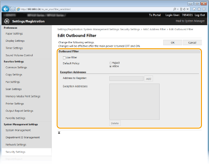 Ako MAC adrese nisu ispravno unesene, možda nećete moći pristupiti uređaju putem sučelja Remote UI (Korisničko sučelje za daljinski pristup). U tom slučaju morate <Filtar MAC adresa> postaviti na <Isključeno>. Filtar MAC adresa
