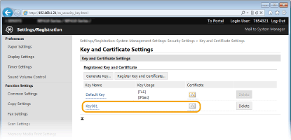 Par ključeva nije moguće izbrisati ako se trenutačno koristi, primjerice kada "[TLS]" ili "[IEEE 802.1X]" se prikazuje u odjeljku [Key Usage]. U tom slučaju prije brisanja onemogućite tu funkciju ili zamijenite par ključeva prije brisanja.