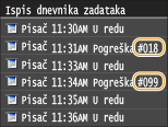 Ako se pojavi pogreška poput neuspješnog ispisa ili nemogućnosti slanja ili primanja faksa ili skeniranog dokumenta, odgovarajuća šifra pogreške pojavit će se u izvješću ili na zaslonu <Dnevnik zadataka> u obliku troznamenkastog broja. Provjerite sljedeće kako biste saznali uzroke i rješenja svake šifre pogreške. Za više informacija o ispisu izvješća o pogrešci i informacijama u izvješću, pogledajte